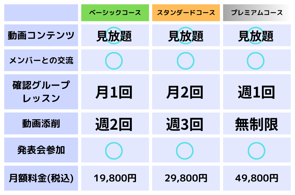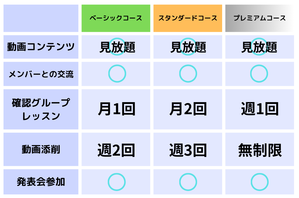 違いは確認グループレッスンと動画添削の利用回数のみですが、サービスの詳細について、ひとつずつご説明していきます。
